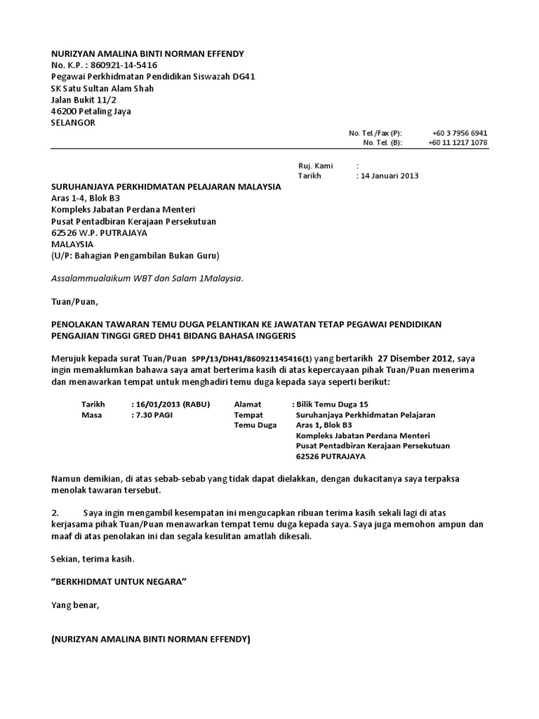 Tuanpuan penolakan tawaran temu duga pelantikan ke jawatan tetap. Yang ingin tahu apa saja tahap dan proses. 4 contoh surat tunjuk sebab tidak hadir kerja kursus.